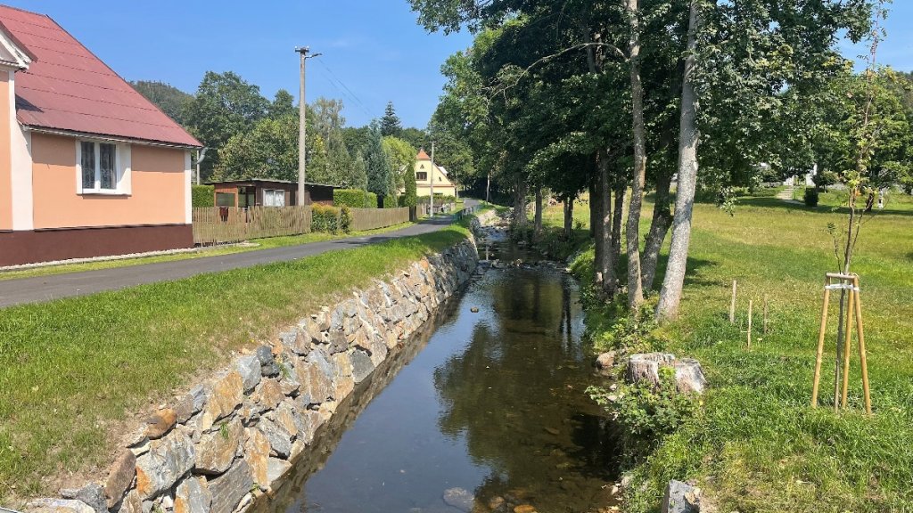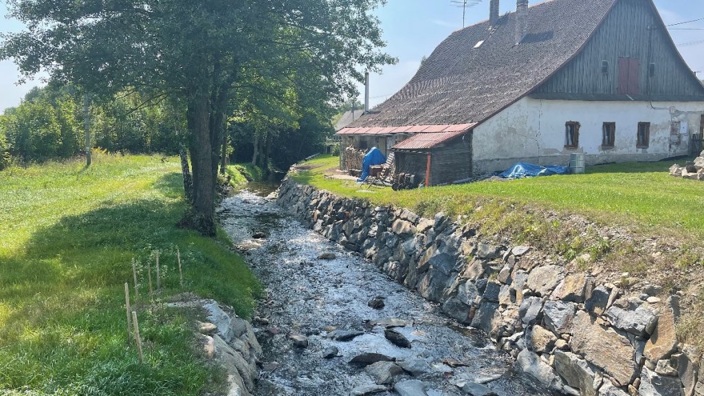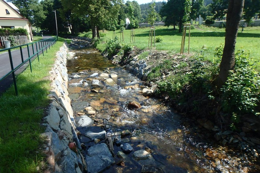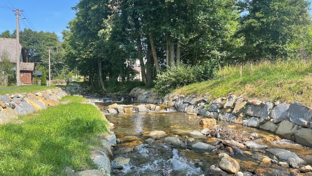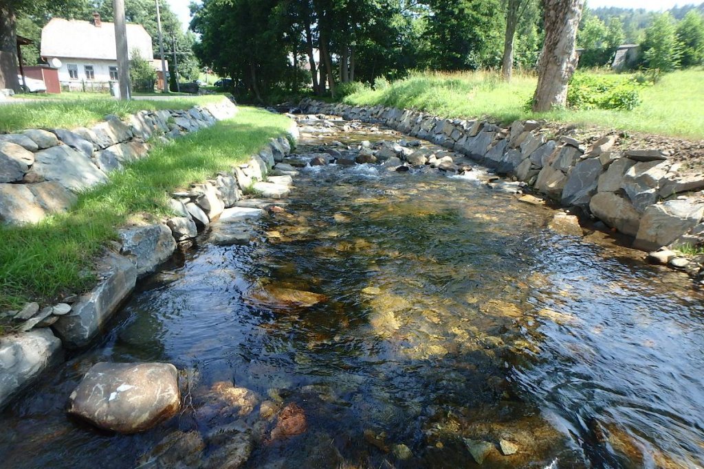 Byla provedena rekonstrukce podélného a příčného opevnění vodního toku. Stávající podélné opevnění (opěrné zdi) bylo nahrazeno opěrnou zídkou z lomového kamene a rovnaninou z lomového kamene. Místo stávajících příčných objektů (dřevěné prahy, stupeň z lomového kamene) byly zbudovány kamenné stabilizační pasy a prahy z lomového kamene. V km 10,683-10,738 byla na pravém břehu vytvořena berma a v toku kamenem opevněná kyneta pro převedení průtoků Q5.